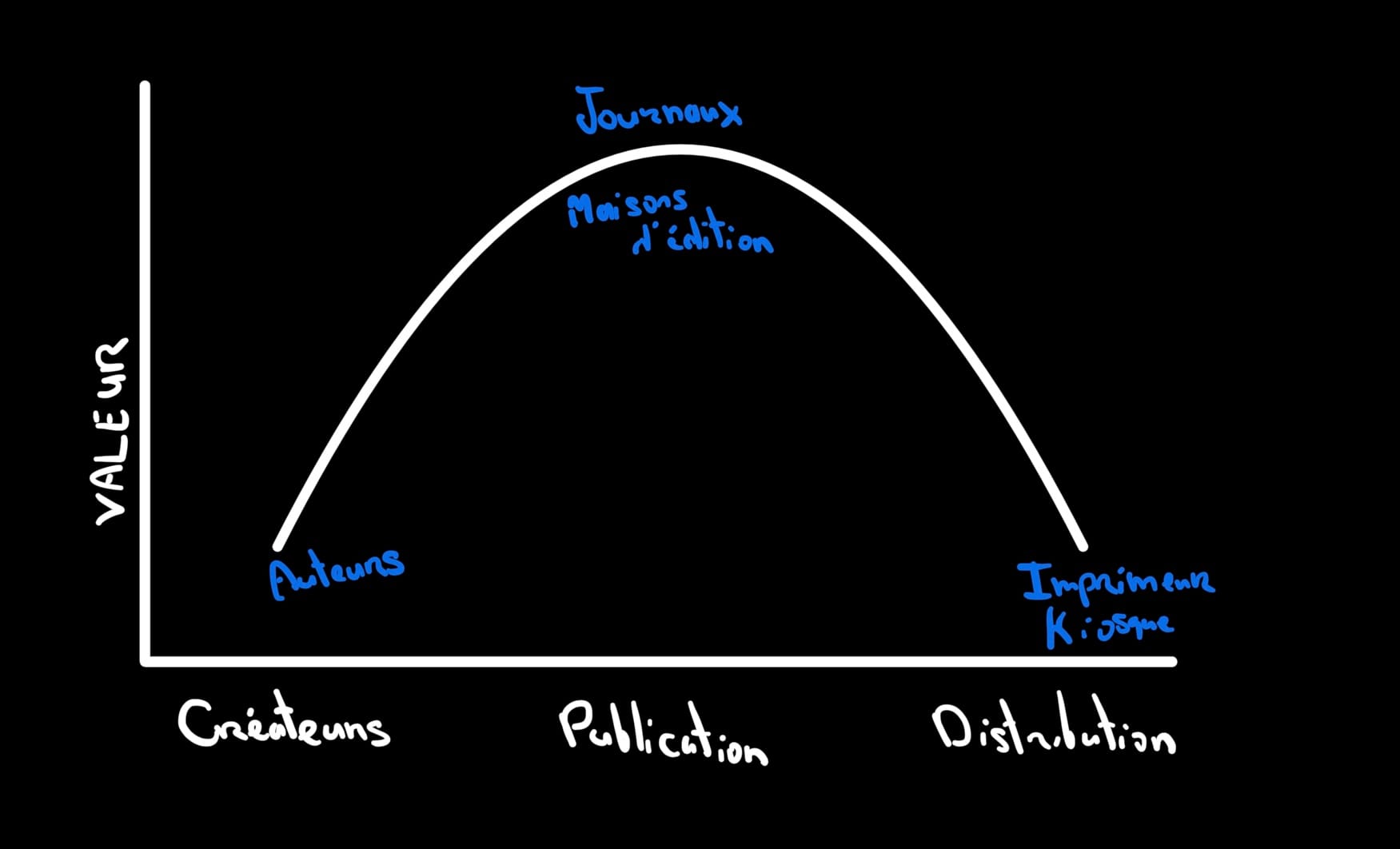 Au niveau des moyens de distribution, il y avait très peu de valeur captée par cette partie de l'équation. Les imprimeurs n'ont jamais capté énormément de la valeur ajoutée et les kiosques, les libraires ou autres n'ont jamais fait beaucoup de marge sur les contenus non plus. On était dans un endroit où l'information était restreinte et centralisée, où les entreprises de publication étaient souveraines.